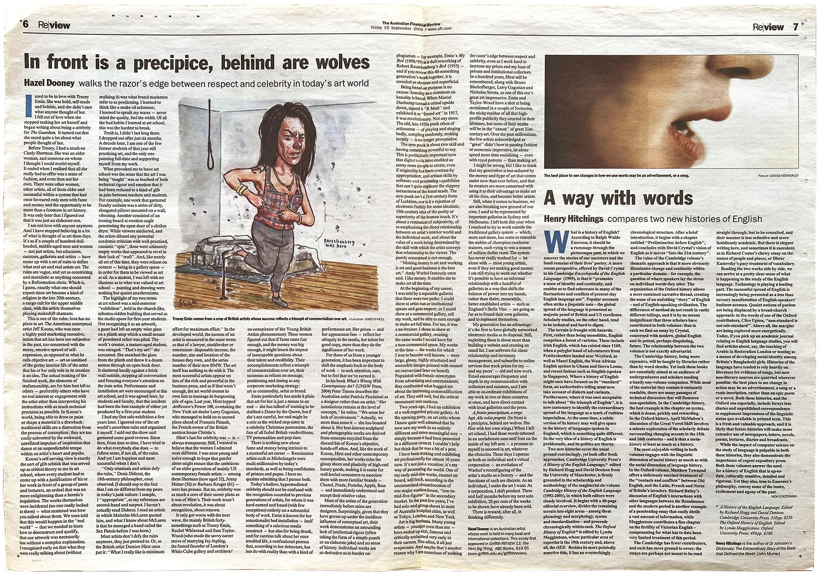2006 Dooney, Hazel. An edited extract of ‘Life Study’ retitled 'In front is a precipice, behind are wolves: Hazel Dooney walks the razor's edge between respect and celebrity in today's art world', The Australian Financial Review, 15 September 2006 (pp. 6-7).
